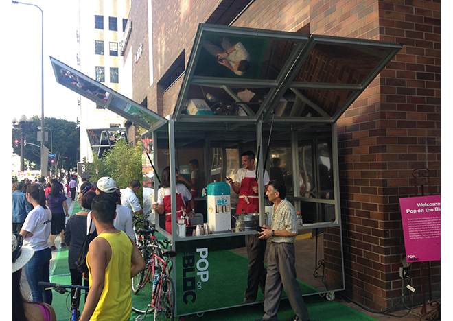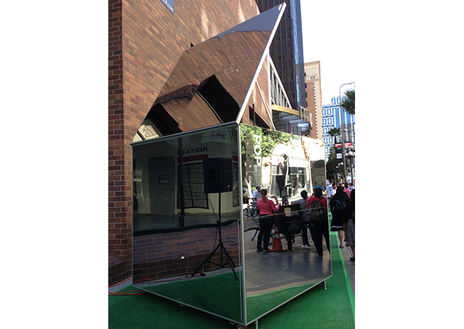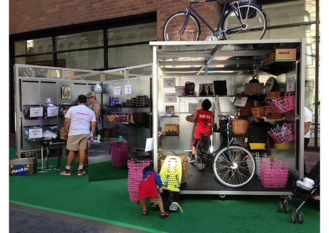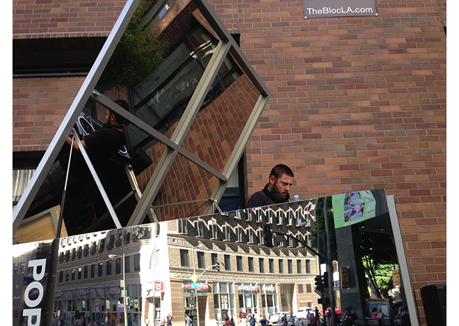 The BLOC project is a series of square cubes that can unfold and accommodate a variety of purposes such as food vending, retail, and DJ booth at street fairs. The Blocs are made of aluminum frames, and clad in mirrored stainless steel and built with heavy duty wheels and are easily transportable. The BLOCs are designed by LOC Architects, and built by Craig Maldonado and Tomas Verde.