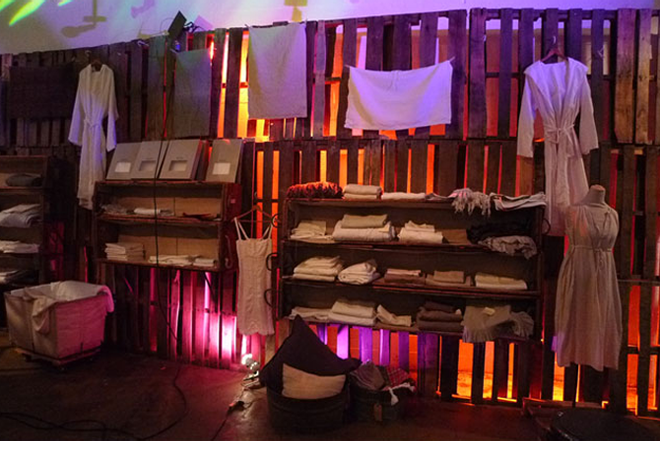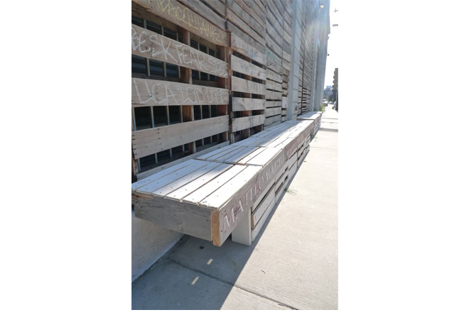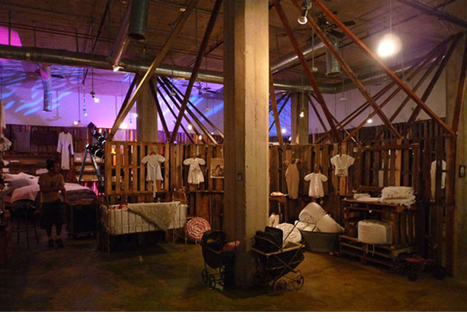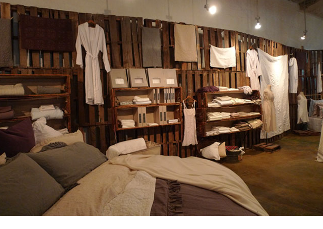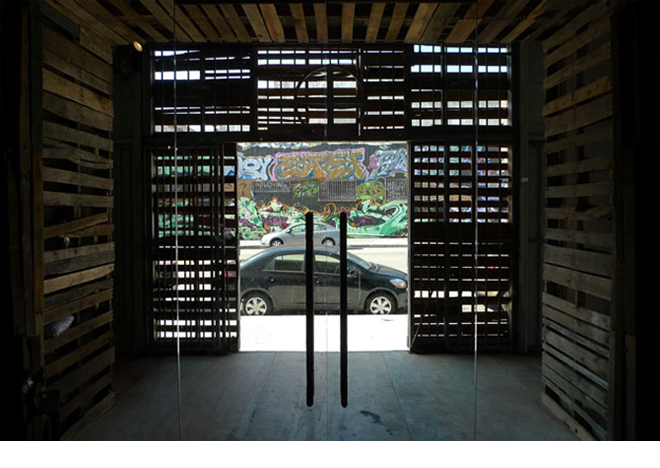A very low budget and large scale installation using predominately found objects make a bold statement for this 2900 square foot showroom in the downtown Arts District of Los Angeles. Shipping pallets collected from the neighborhood were used to create free flowing, organic curving walls and to create separate spaces for the various products sold by the client- while maintaining an entirely green design and recyclable aesthetic.